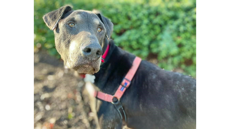 Thunder is a giant, handsome sweetheart who wants to follow his humans around and give them love. He has a gingerly, graceful walk. He passes other dogs (even a barking dog) with a low, wagging tail and a friendly posture. He is patient with being handled all over his body, and he runs happily in the yard. He shows his excitement in seeing humans by jumping, but he is treat-motivated and can learn how to control his eagerness.