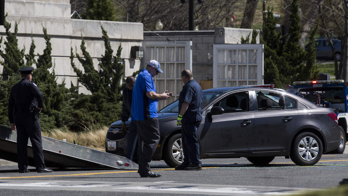 The driver gets out of the vehicle to assess the damage caused by the stunt and deems that he should attempt to flee regardless of the fact his Kelly Blue Book value has just plummeted in mere seconds. He seems to have difficulty getting his vehicle moving on its own.