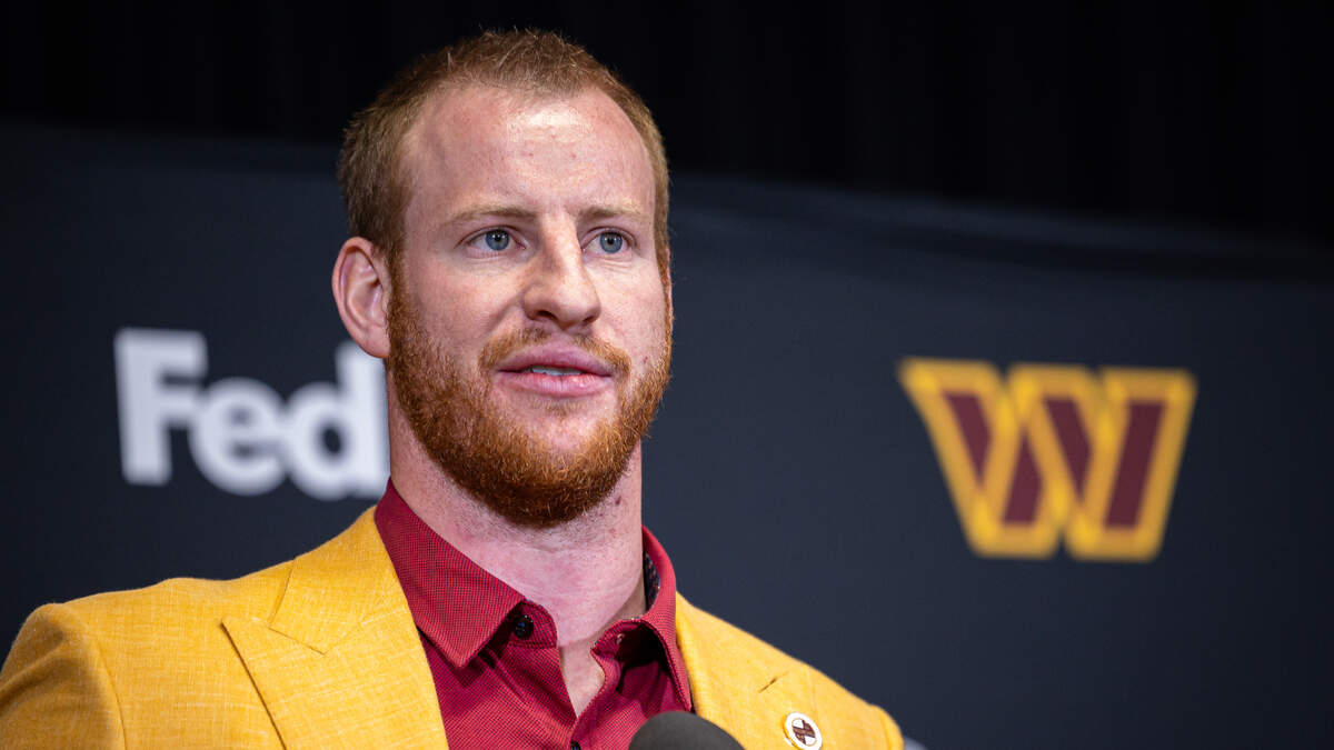 Washington Commanders QB Carson Wentz speaks with media